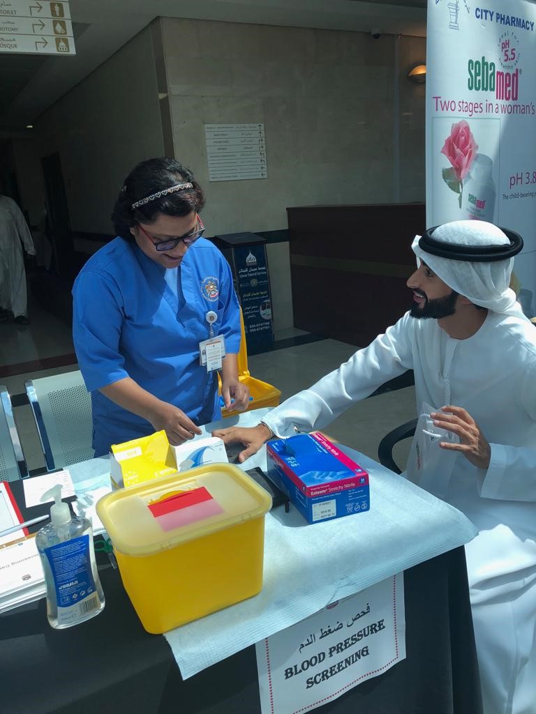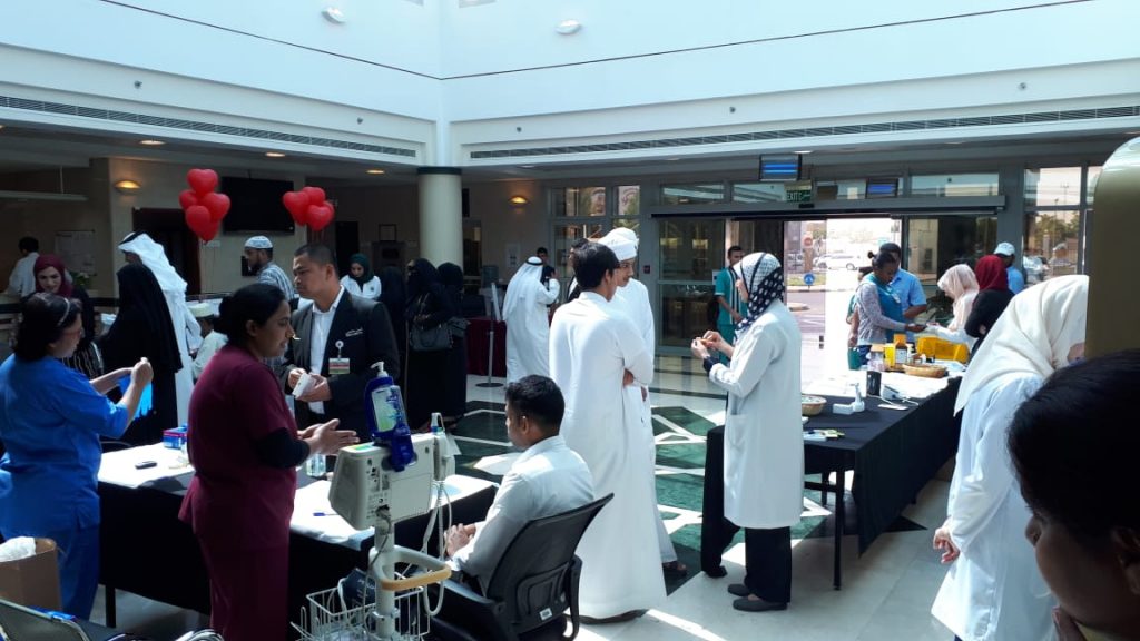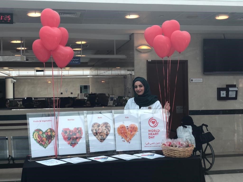 الهدف كان تثقيف المرضى والزوار حول أمراض القلب والشرايين حيث قدم قسم التمريض العيادات الخارجية خدمات فحص السكر في الدم والضغط و فحص كتلة الجسم و فحص لخصلة الشعر والبشرة بمشاركه صيدليات معتمده باجهزه حديثه لحوالى 150 شخص ، و قدمت أخصائيه التغذيه رشا خليل الهريدي ارشادات غذائيه خاصه لمرضى القلب والأوعيه الدمويه ونموذج لحميه قليله الملح والدهون ،بالاضافه الى امثله لاستبدال الدهون الضارة بالدهون الصحية في الوجبات الغذائية ، وذلك لتعزيز صحتهم والوقايه من مخاطر امراض القلب المنتشره بسبب زياده معدلات السمنه و قله النشاط البدني في المجتمع ، وقد لاقت الفاعلية نجاحا كبيرا من المشاركين المتترددين على العيادات و موظفى المستشفى
